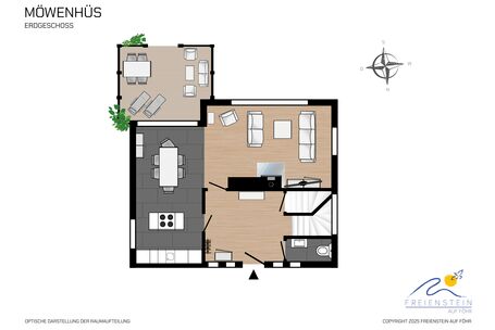 Herzlich willkommen in unserem Haus am Wasser. Das Einzelhaus steht in absoluter Spitzenlage zwischen Nieblum und Wyk in unmittelbarer Nähe zum Meer und nur wenige Schritte vom schönsten Golfplatz Schleswig Holsteins entfernt. Der exklusive Ortsteil Greveling besteht aus wenigen Einzelhäusern unter Reet, die fast alle auf eigenen kleinen Warften in exponierter Lage direkt an der Nordsee liegen. Hier wohnen Sie einzigartig auf Föhr. Genießen Sie den hohen Komfort und die Großzügigkeit der lichtdurchfluteten Räume in Ihrem Reethaus. Die geschmackvolle Einrichtung begeistert, und der herrliche, zur Nordsee liegende Garten mit großer Terrasse und freiem Meerblick verleitet zum Träumen.
