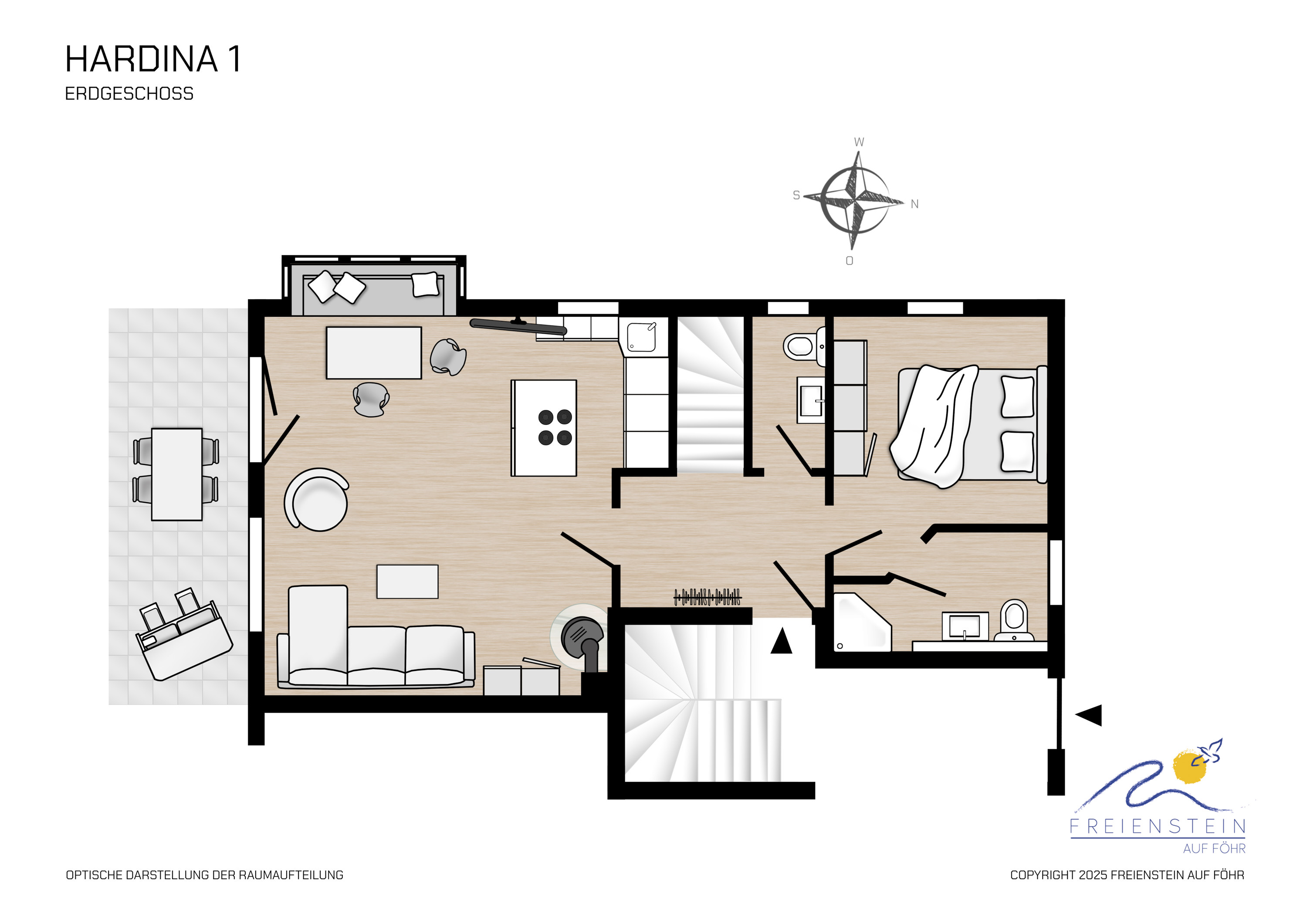 Herzlich Willkommen in unserem gepflegten Appartement Hardina 1. Das Haus steht in absoluter Traumlage direkt am Südstrand von Wyk. Von der Terrasse genießen Sie einen Blick auf das Meer und die Halligen. Eine kleine Dünenkuppe bietet jedoch genügend Schutz, wenn es doch einmal ein bisschen stürmisch wird. In diesem Appartement mit hohem Komfort werden Sie bestimmt einen unvergesslichen Urlaub genießen.