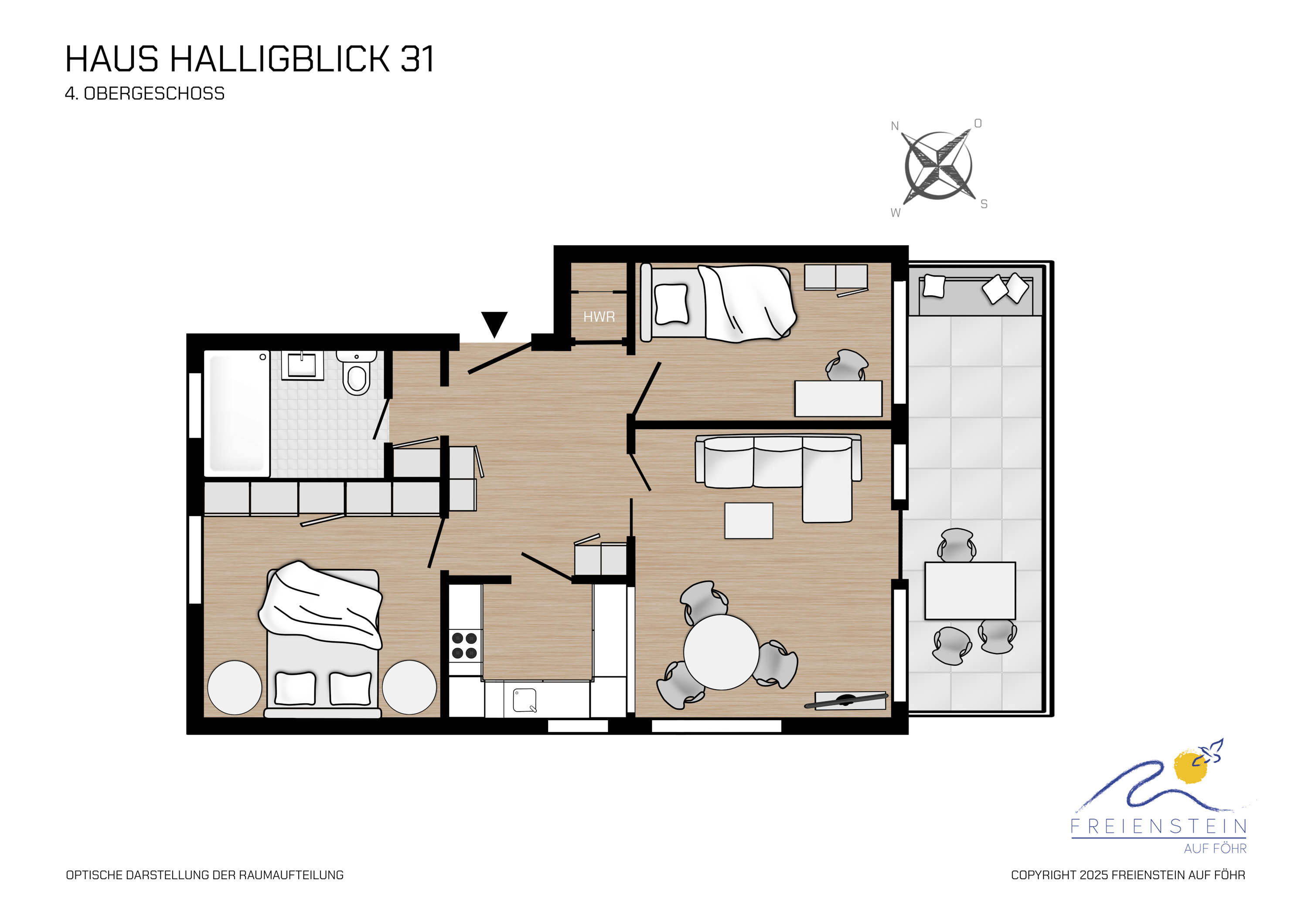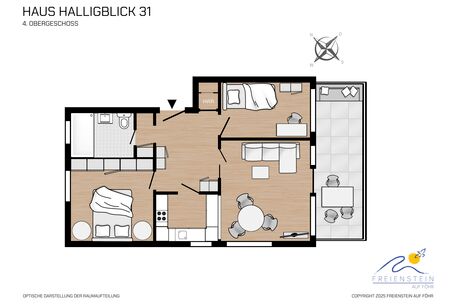 Zwischem dem Wyker Südstrand und Nieblum steht das beliebte Terrassenhaus Haus Halligblick. Die Lage ist wohl einmalig: direkt am Meer, mit Blick nach Süden in Richtung der Halligen in bester Umgebung. Ganz in der Nähe liegen der Golf- und Sportflugplatz, die bequem zu Fuß zu erreichen sind. Von dort ist es nur ein Sprung nach Greveling, der Gruppe von Reethäusern im Friesenstil. Nach Nieblum, einem der schönsten Orte Schleswig-Holsteins, ist es kaum weiter als zum Zentrum Wyks. Nicht ohne Grund gilt der Südstrand als Geheimtip. Die Wohnung 31 ist eine Eckwohnung und Sie haben einen phantaschtischen Blick auf die Halligen und auch nach Amrum. ++ Bitte beachten Sie: in der mittleren Hausscheibe – Am Flugplatz 1a – werden vom 09.03. – 31.03.2026 die Fenster ausgetauscht. Weitere Informationen teilen wir Ihnen gerne persönlich mit.