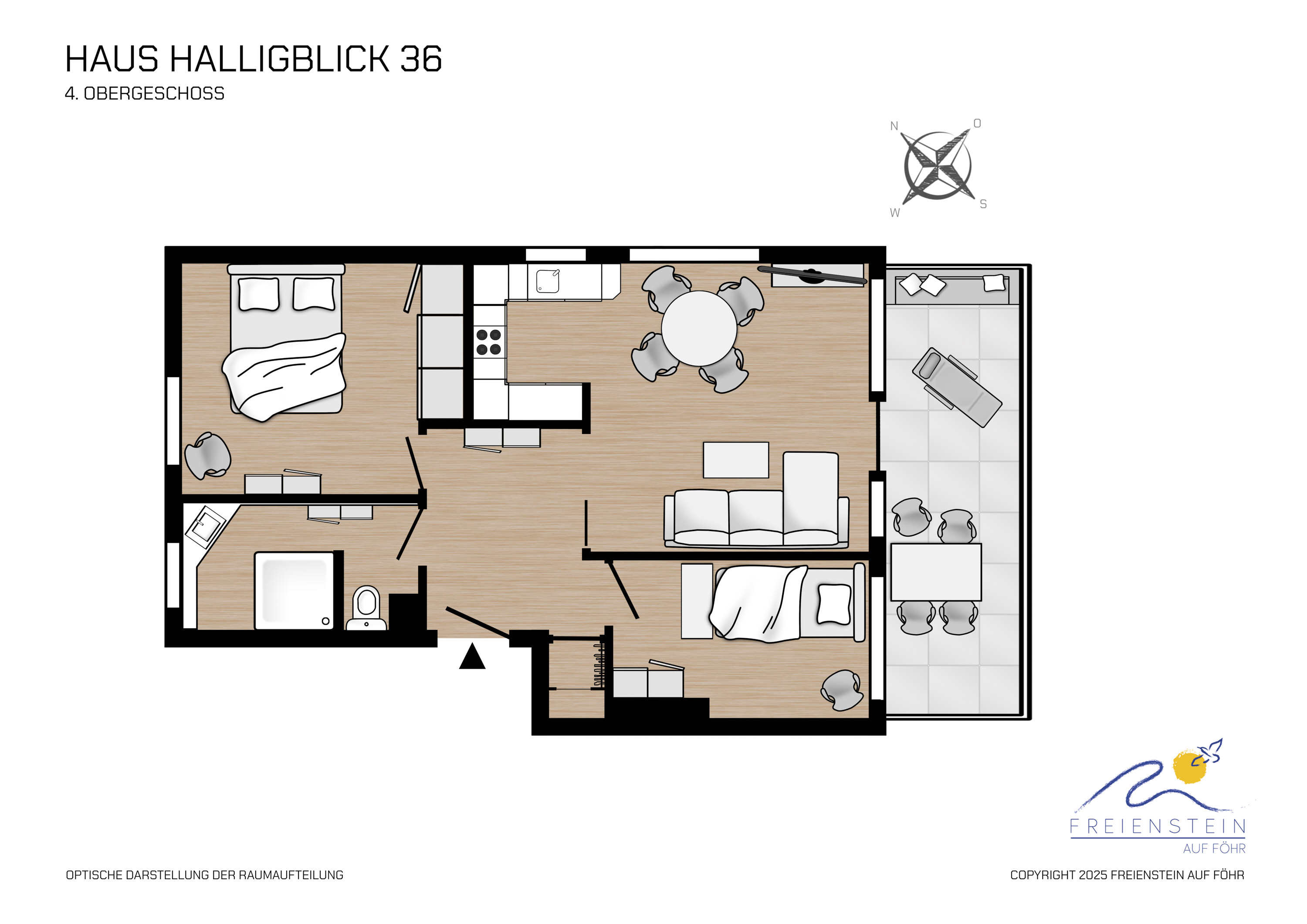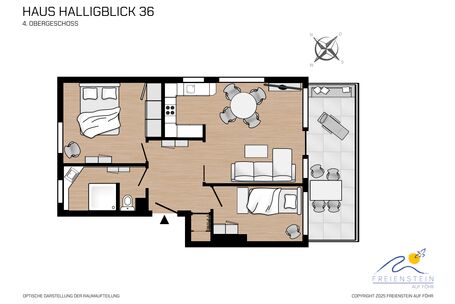 Zwischem dem Wyker Südstrand und Nieblum steht das beliebte Terrassenhaus Haus Halligblick. Die Lage ist wohl einmalig: direkt am Meer, mit Blick nach Süden in Richtung der Halligen in bester Umgebung. Ganz in der Nähe liegen der Golf- und Sportflugplatz, die bequem zu Fuß zu erreichen sind. Von dort ist es nur ein Sprung nach Greveling, der Gruppe von Reethäusern im Friesenstil. Nach Nieblum, einem der schönsten Orte Schleswig-Holsteins, ist es kaum weiter als zum Zentrum Wyks. Nicht ohne Grund gilt der Südstrand als Geheimtip.