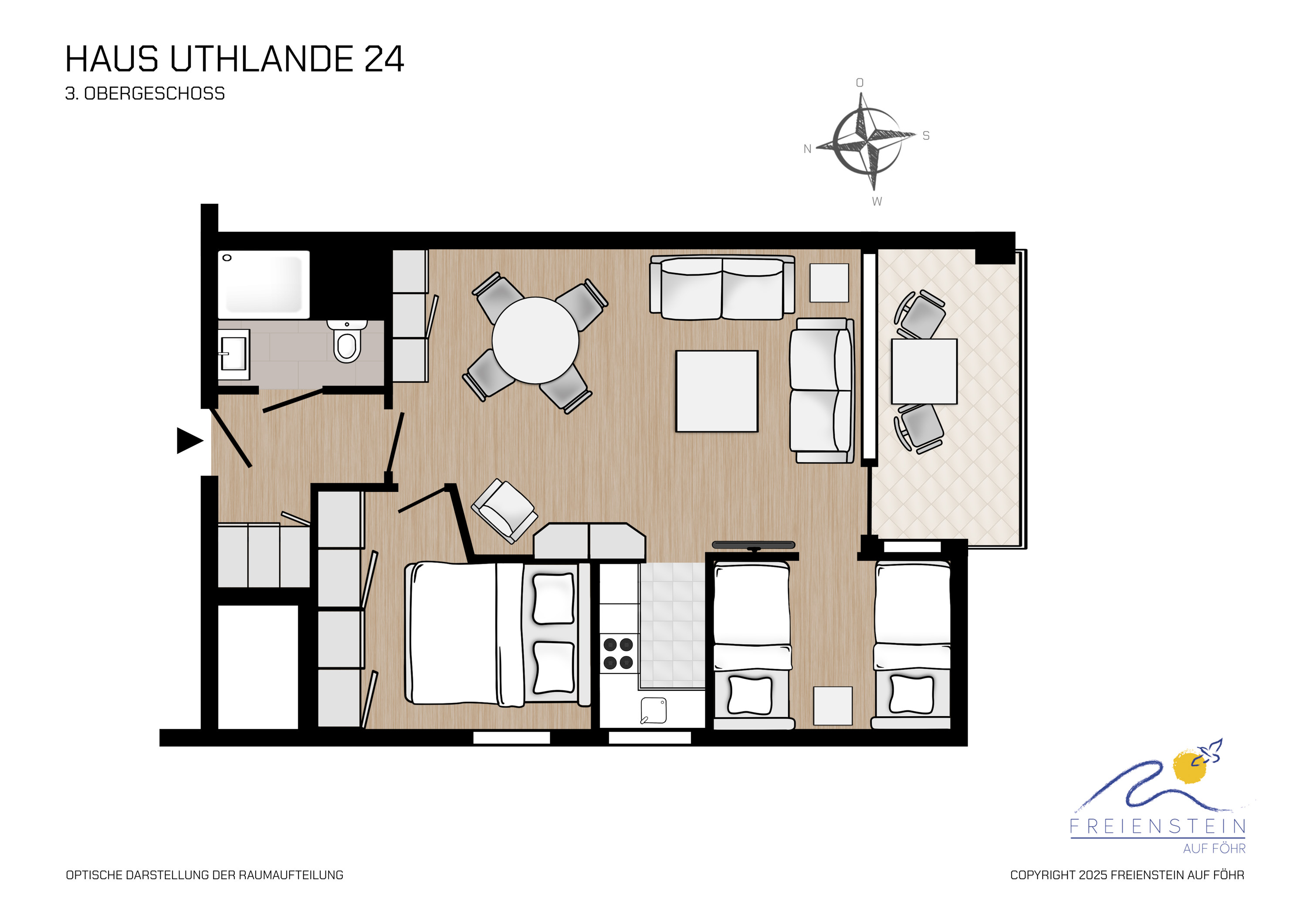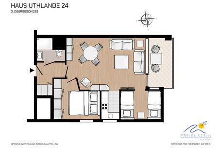 Das Haus Uthlande befindet sich in einer gehobenen Ferienanlage am Rande von Wyk. Umgeben von Wäldern, dem gegenüberliegenden Golfplatz und dem nahen Freizeitflughafen bietet es mit dem Sandstrand und der Nähe zu Greveling (den einmaligen Reetdachhäusern auf eigenen kleinen Warften) ein schönes Freizeitangebot. Die Wohnung befindet sich in der dritten Etage und wurde mit viel Liebe zum Detail eingerichtet. Genießen Sie das geschmackvolle Ambiente oder lassen Sie sich auf dem überdachten Balkon von der Sonne kitzeln. Wir wünschen Ihnen schon jetzt viel Spaß und einen angenehmen Aufenthalt.