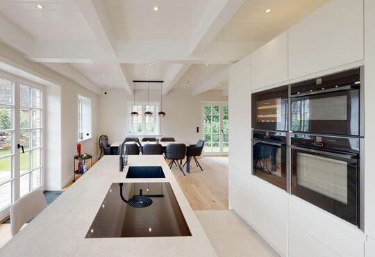 Das Reethüs Oevenum auf Föhr bietet Platz für bis zu sechs Personen und auch ein Hund ist herzlich willkommen. Die Highlights des Einzelhauses sind ein großzügiger, offener Wohn- und Essbereich, eine sonnige Südwest-Terrasse mit hochwertiger Möblierung und ein stilvoller Panorama-Kamin, der auch an kühleren Tagen für gemütliche Atmosphäre sorgt. In der voll ausgestatteten Küche sind besonders zu erwähnen: die zwei Backöfen, Dampfgarer, Quooker-Wasserhahn, sowie eine separate Speisekammer und ein HWR mit Waschmaschine, Trockner und großem Gefrierschrank. Die drei komfortablen Schlafzimmer - ein Schlafzimmer mit Bad En-suite - mit Boxspringbetten befinden sich im Obergeschoss. Zwei moderne Duschbäder - eines im Erdgeschoss und eines im Obergeschoss runden die Raumaufteilung ab.