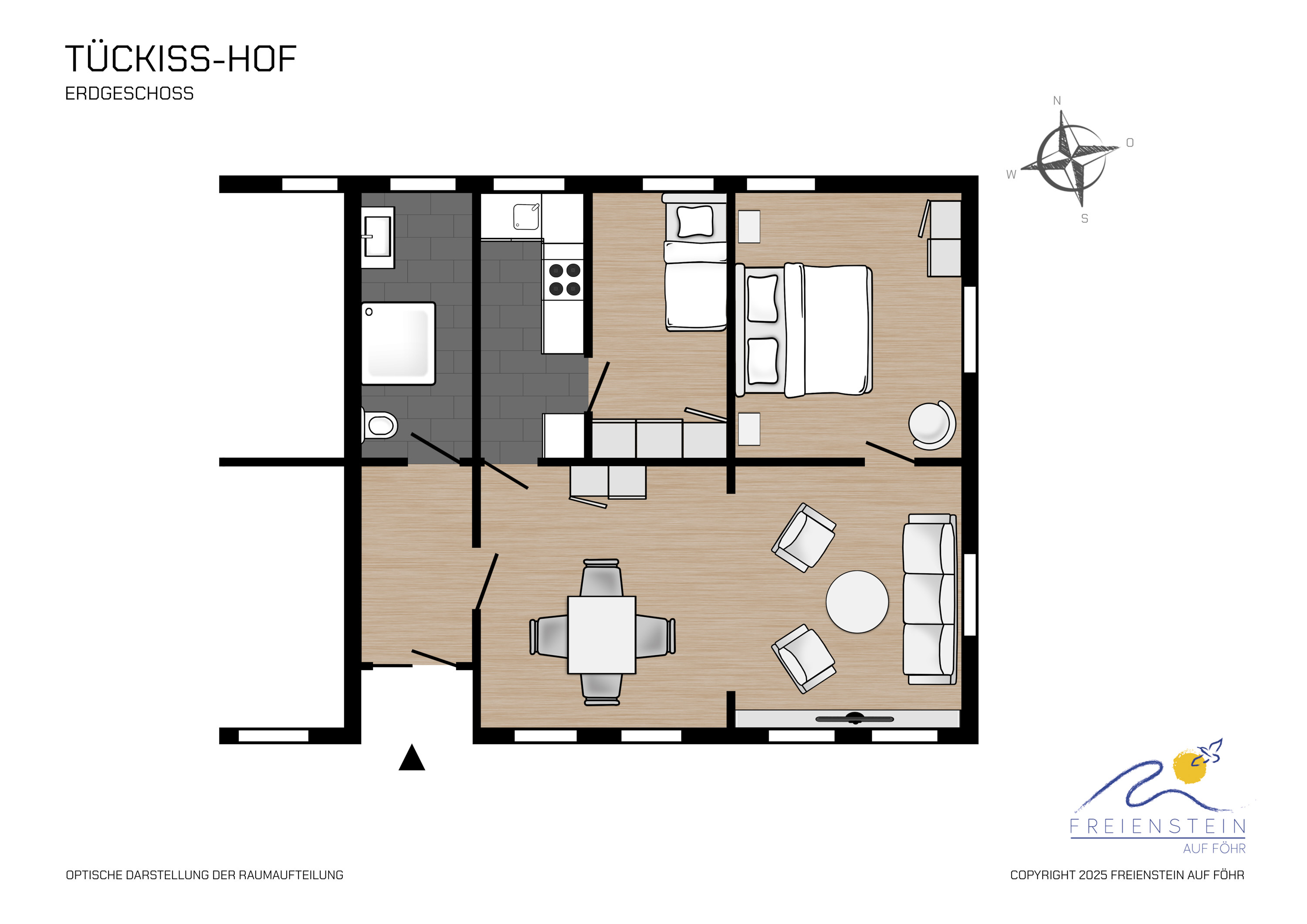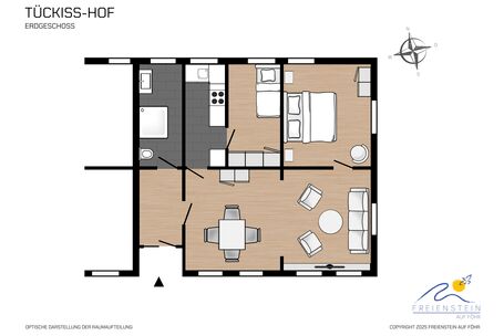 Die heutigen Eigentümer haben den Tückiss Hof unter Einbeziehung des Denkmalschutzes mit großem Aufwand stilsicher restauriert, modernisiert und mit ausgewähltem Mobiliar, schöner Dekoration und besonderen Accessoires eingerichtet. Die Erdgeschoßwohnung mit ca. 1400 qm großem Südgarten und altem Baumbestand bietet ein herrliches Wohlfühlambiente für Ihre Auszeit auf Föhr