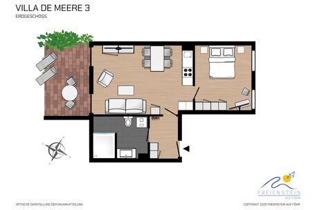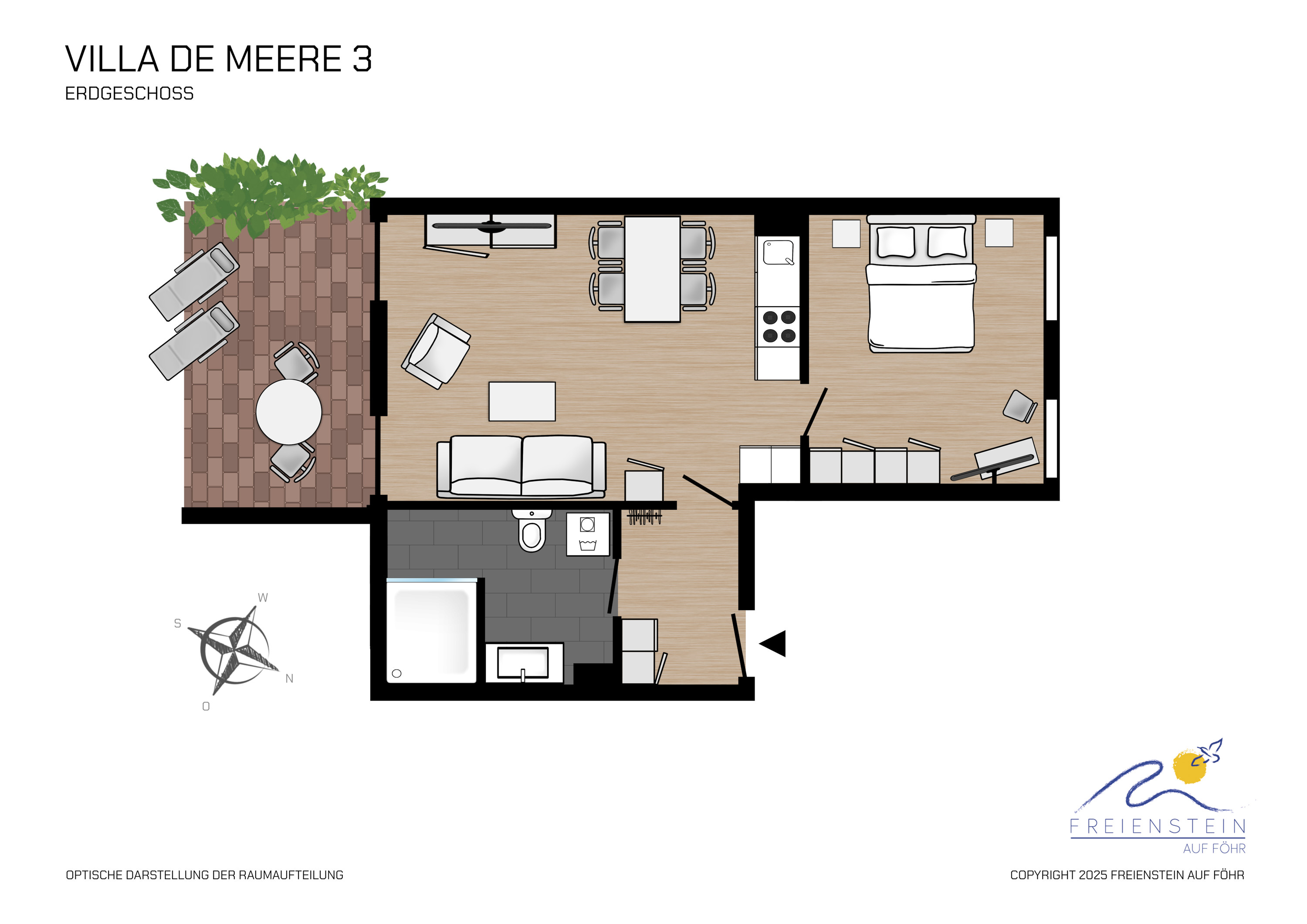 Das Objekt Villa de Meere - mit 8 individuellen und exklusiven Wohnungen - befindet sich in einer Seitenstraße nahe dem Nieblumer Ortskern, direkt am Dorfteich de Meere. Das gesamte Ortsbild des wohl schönsten Inseldorfes ist geprägt von reetgedeckten, alten Kapitänshäusern, wunderschönen Bauerngärten und dem Friesendom St. Johannis. Der Nieblumer Strand liegt nicht weit vom Ortskern entfernt. Cafés, Restaurants sowie ein Bäcker und Einkaufsmöglichkeiten für den täglichen Bedarf sind im Ort vorhanden und bequem zu Fuß zu erreichen.