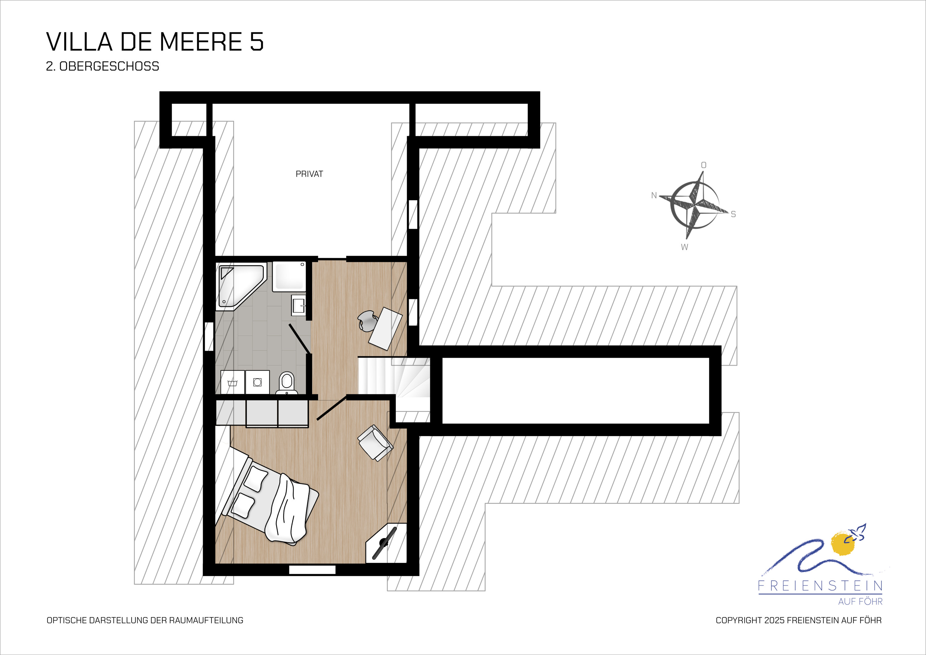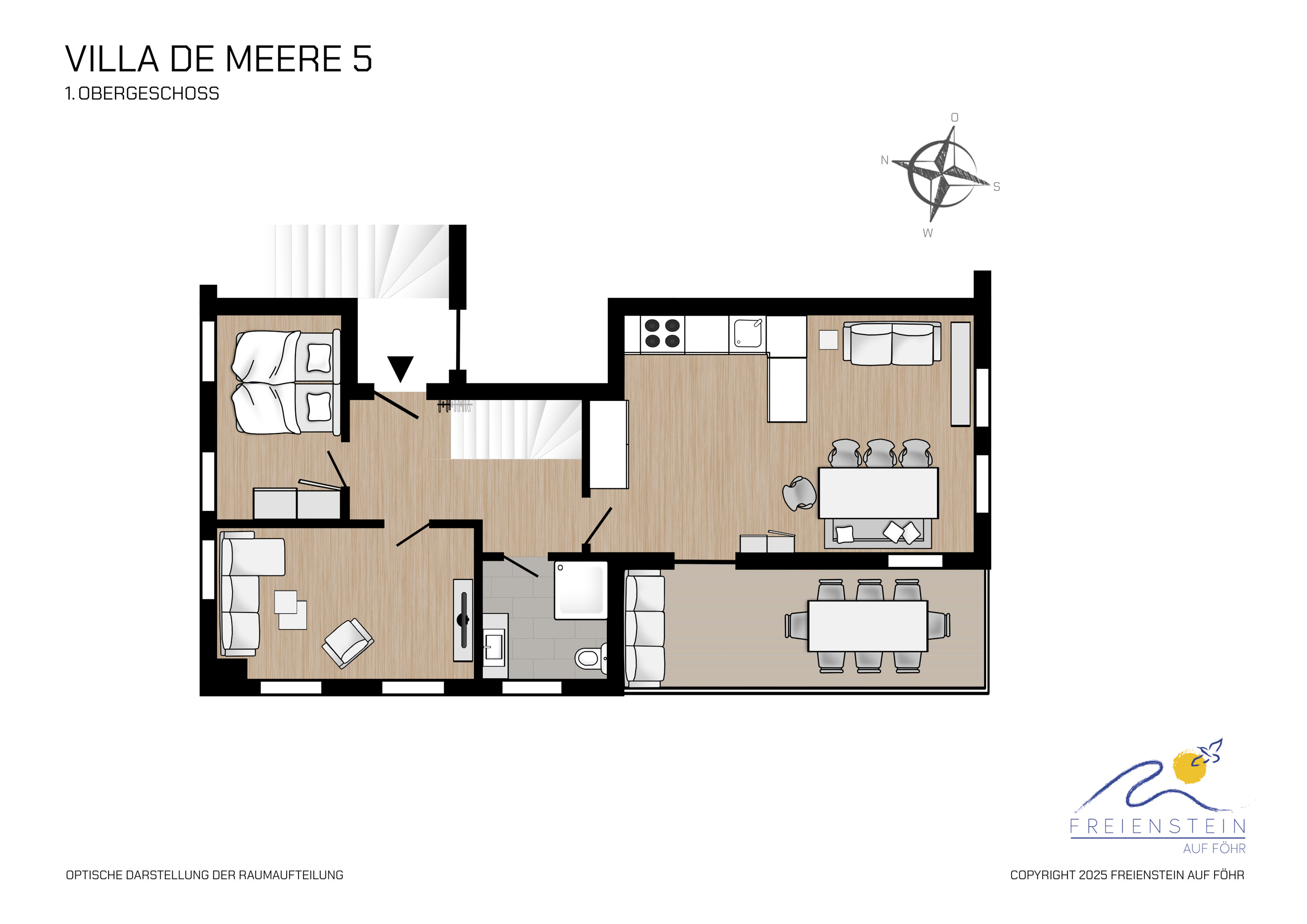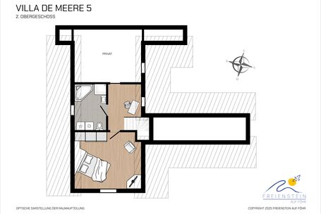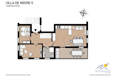 Das Objekt Villa de Meere - mit 8 individuellen und exklusiven Wohnungen - befindet sich in einer ruhigen Seitenstraße nahe zum Nieblumer Ortskern. Die Wohnung Villa de Meere 5 zeichnet sich durch eine große Dachterrasse mit gemütlichen Lounge Möbeln aus. Die Terrasse wird sicherlich Ihr Lieblingsplatz. Hier fängt der Tag mit einem ausgiebigen Frühstück an und am Abend genießen Sie Ihr Glas Wein mit Blick auf die Grünanlage und auf den Dorfteich De Meere". Die Küche, mit dem wunderbar großen Essplatz, ist das Herzstück der Wohnung, Kochen, Klönen und den Urlaubstag planen. Wenn die Zeit zur Entspannung ist, bieten Ihnen die gut geschnittenen Schlafräume viel Platz..Nieblum selbst ist wohl das schönsten Inseldorf und geprägt von reetgedeckten alten Kapitänshäusern, wunderschönen Bauerngärten und dem Friesendom St. Johannis. Der Nieblumer Strand liegt nicht weit vom Ortskern entfernt. Cafés, Restaurants sowie ein Bäcker und Einkaufsmöglichkeiten für den täglichen Bedarf sind im Ort vorhanden und bequem zu Fuß zu erreichen.."